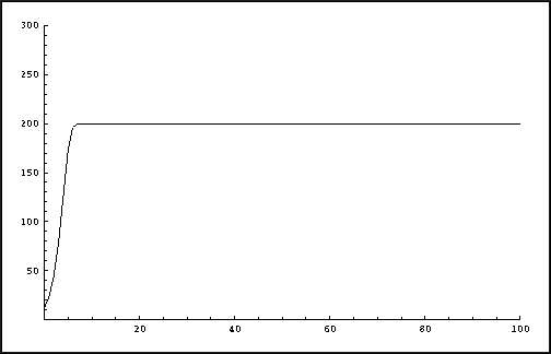 The picture shows a monotonic increase towards the saturation value E. It is suprising to see what happens if we vary lambda, but still use E = 200 and p0 = 12. The following two pictures show the results over 100 years for lambda = 3.1 and lambda = 4. In the former case the population eventually oscillates between two different values. The latter case shows an unexpected, complicated behavior: chaos!