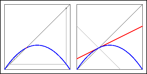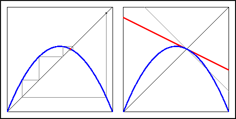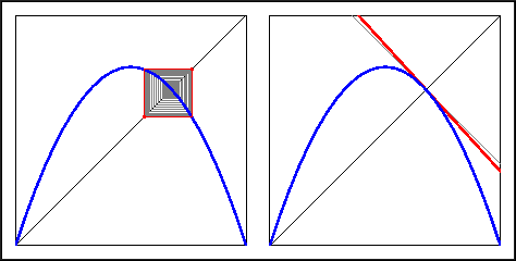 Recall your investigations in the Warm Up Questions. In the figure above (right) the graph of the derivative map at the fixed point is drawn in read. Also drawn are the two special lines with slope 1 and -1. The figure clearly shows that the derivative at the fixed point lies in between -1 and 1, so that the fixed point is attracting.